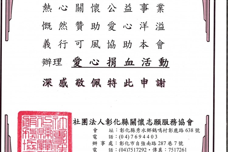 社會公益-感謝狀-社團法人彰化縣關懷志願服務協會